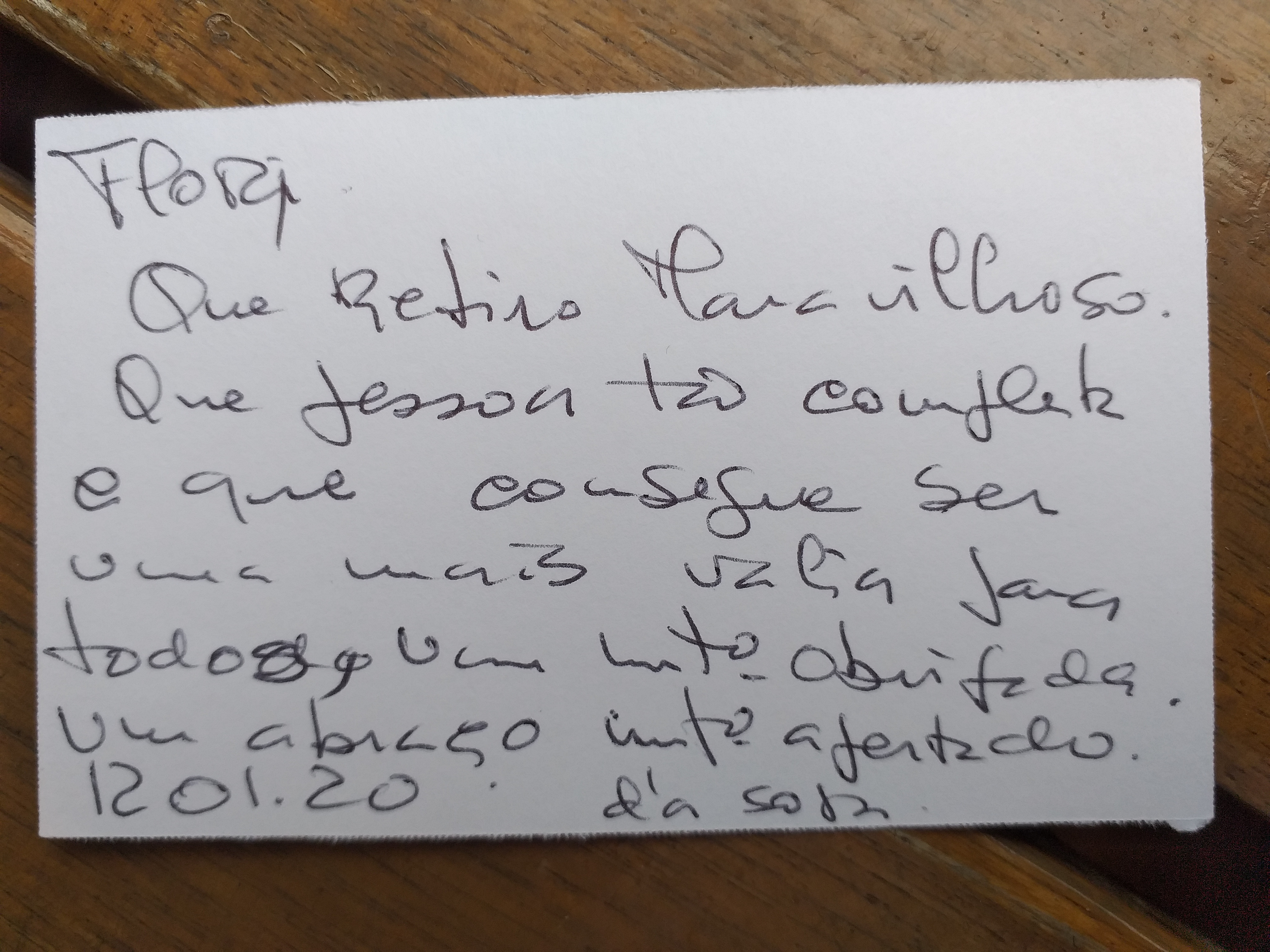 “Só posso dizer que tendo eu já feito muitas outras formações nesta área ou similar, mais curtas que esta, não tenho dúvida nenhuma que esta tem sido a mais rica, de conteúdo altamente transformador e prática fortemente inspiradora para a continuação de meu Caminho. Gratidão a vós por me terem proporcionado esta experiência maravilhosa.” F. Frazão, Farmacêutica