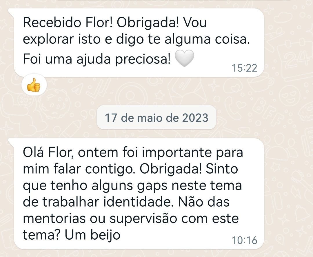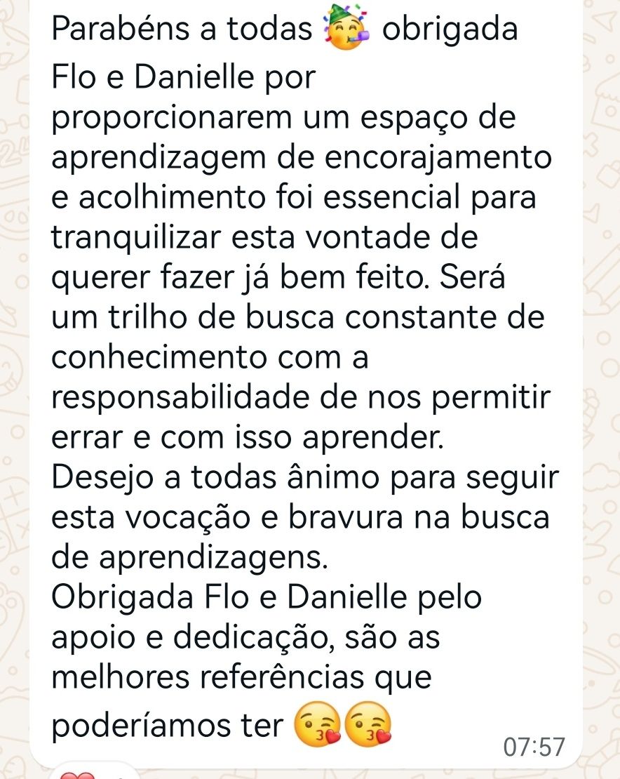 “Obrigada pela maravilhosa e conectada formação que nos deste ontem! Já me fez repensar tanto…Agradeço a teoria, a prática e sobretudo o que me fez sentir e o sentido de tudo o que foi falado...” N. Marques | Psicóloga